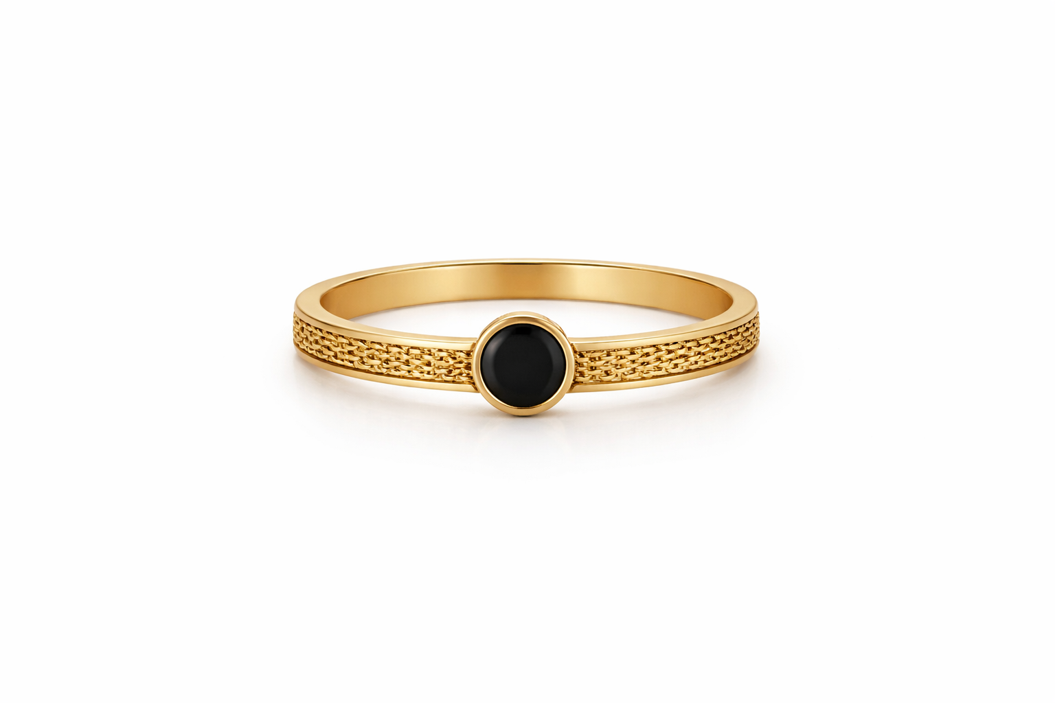 Featuring a sleek black enamel centerpiece set in polished gold, this ring is elevated by a beautifully braided band that wraps around your finger with rich texture and shine. The woven gold detail adds depth and dimension, creating a refined balance between modern minimalism and timeless luxury.