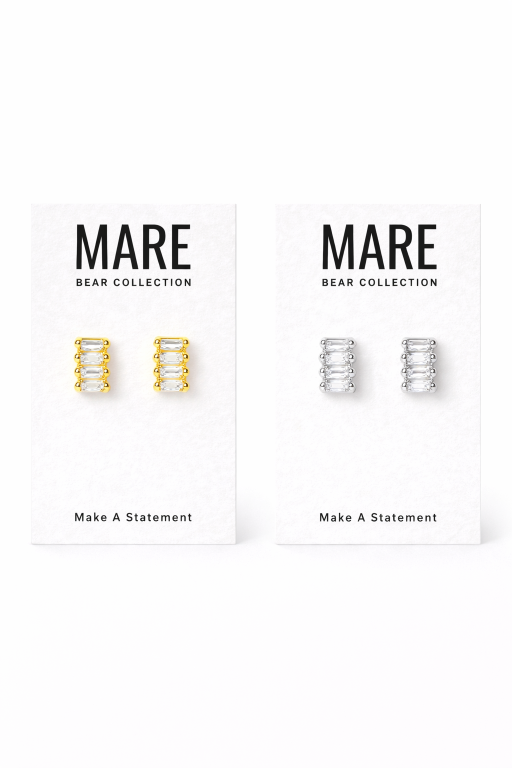 These silver stainless steel studs feature stacked baguette-cut rhinestones that catch the light with every turn. Designed to elevate your everyday look, they offer a refined sparkle without overpowering your style.