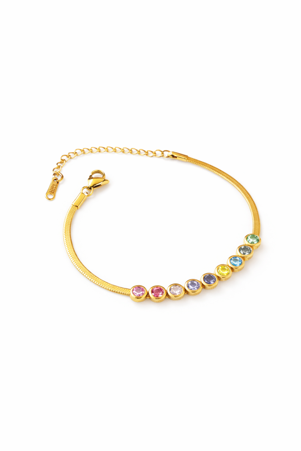 The Color Crush Bracelet features a sleek gold snake chain accented with a row of vibrant bezel-set stones in a playful rainbow palette. Feminine, minimal, and effortlessly chic, this bracelet is designed to layer beautifully or shine on its own.