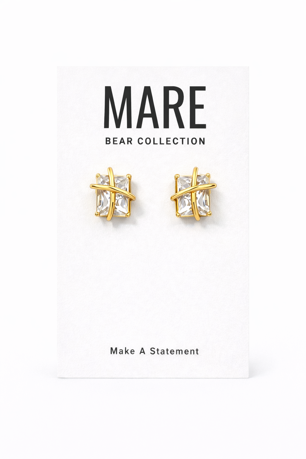 Bold meets timeless. The Golden Embrace Studs feature a brilliant emerald-cut stone wrapped in sleek gold bands that cross delicately over the surface — creating a modern, sculpted look that catches the light from every angle.